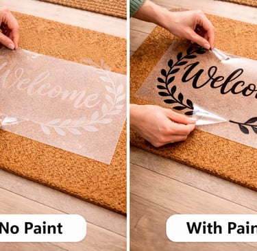 First, find a dry space to work. I typically work outside or in my garage. I lay out an old blanket or drop cloth and set my blank doormat down. After printing and cutting the design of my choosing on the Cricut, I weed out the vinyl and lay it out on the doormat. If you're using Cricut (I'll give another option later for those that don't have a Cricut or similar cutting machine), you'll use the glad press and seal instead of your typical transfer tape. Use a squeegee or even a credit card will work to transfer the vinyl onto the glad press and seal paper.